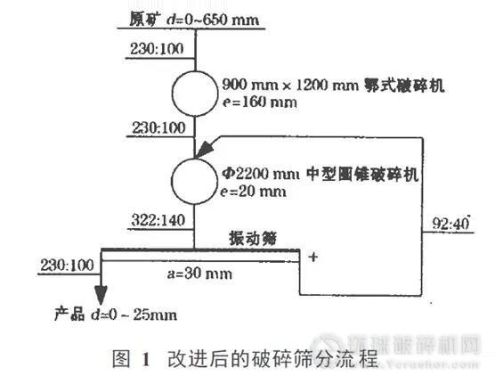通過(guò)理論計(jì)算,各破碎篩分設(shè)備在調(diào)整排礦口和破碎比之后,其計(jì)算的處理能力都符合各設(shè)備的理論處理能力。將該二級(jí)破碎篩分流程調(diào)整后見(jiàn)圖1: