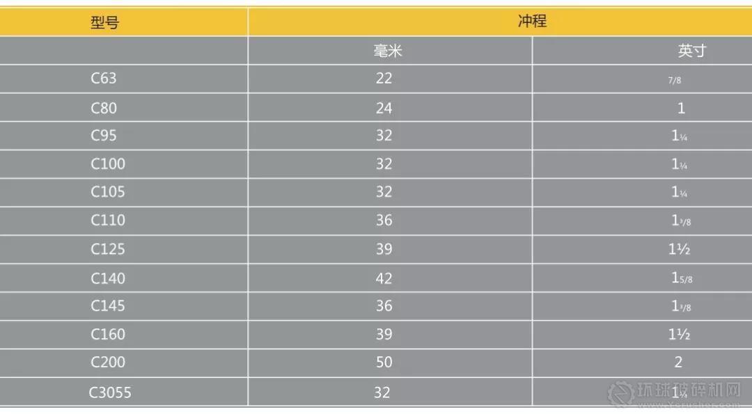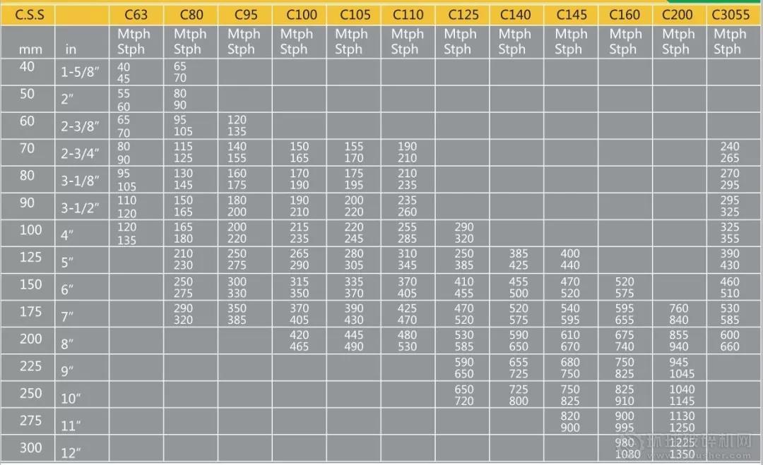 該值與松邊排料口(O.S.S)非常接近(相差 ±2mm或±0.08”)。如前面所述,緊邊排料口是通過用松邊排料口減去沖程計算得出的,如下表:在計算緊邊排料口(C.S.S)時從松邊排料口(O.S.S)減去的尺寸(沖程)表。