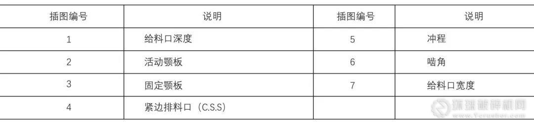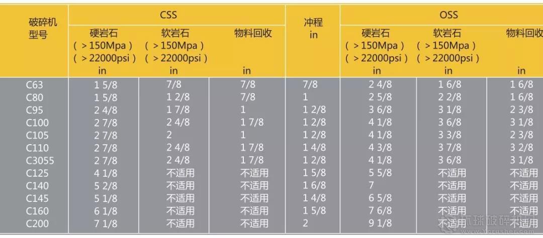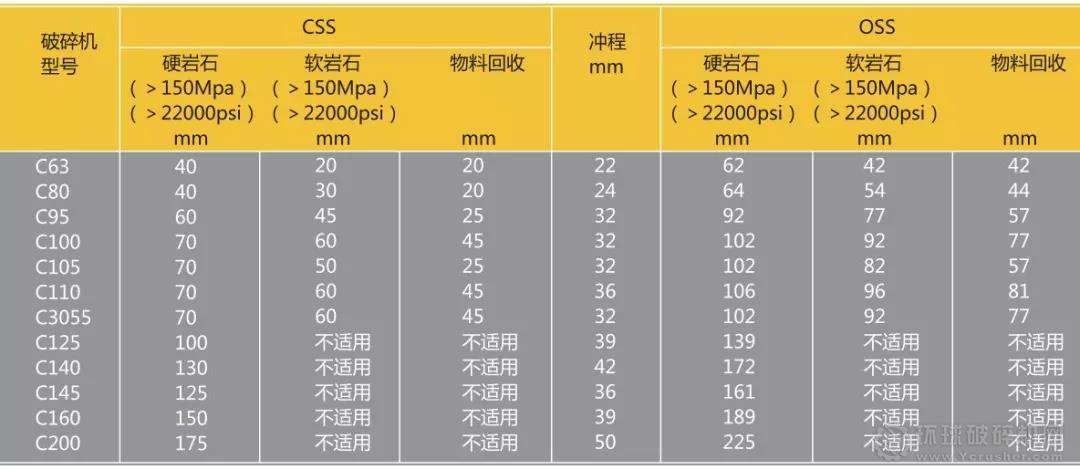硬巖石、軟巖石和物料回收應(yīng)用的最小允許排料口相關(guān)數(shù)據(jù)表