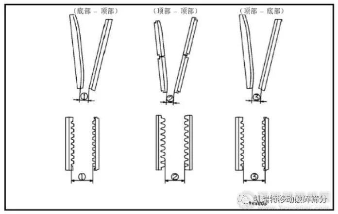 排料口是在固定鄂板和活動鄂板工作循環(huán)過程中測得的固定鄂板和活動鄂板底部之間的最短距離。這一距離被稱作緊邊排料口 (C.S.S),通常是指在破碎機停車過程中測定破碎機排料口的計算距離。