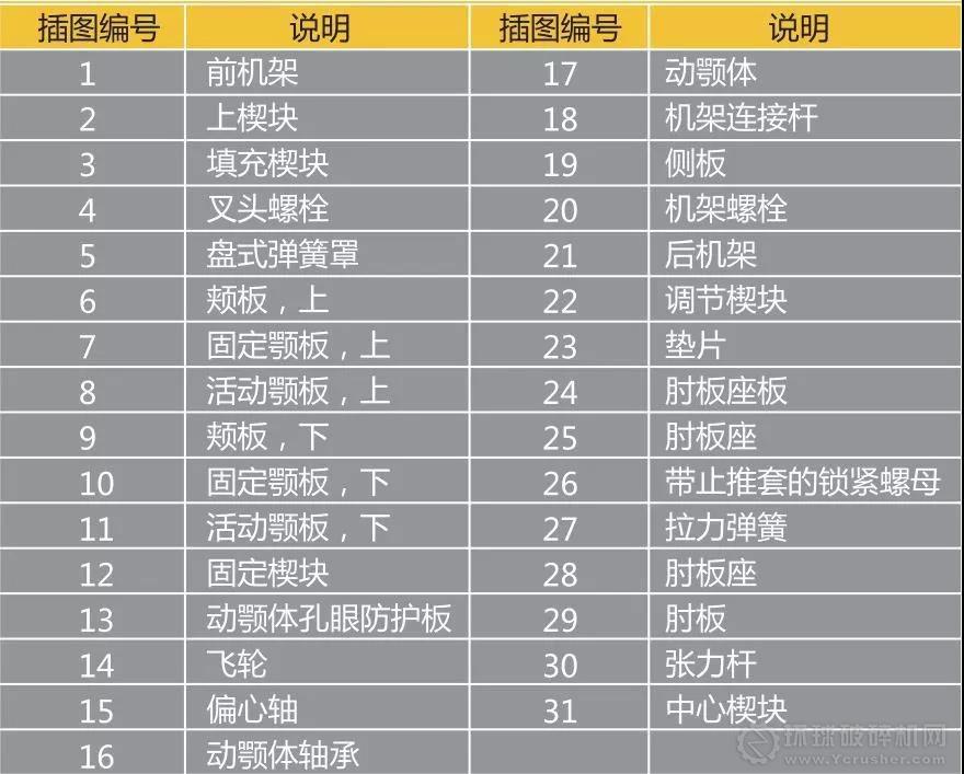 完成破碎的主體部件,通常形似于鄂口。鄂板包括固定鄂板和活動鄂板。根據(jù)型號的不同,固定鄂板和活動鄂板分別由1塊或2塊板組成。根據(jù)不同的破碎需求,可選擇不同形狀的鄂板。