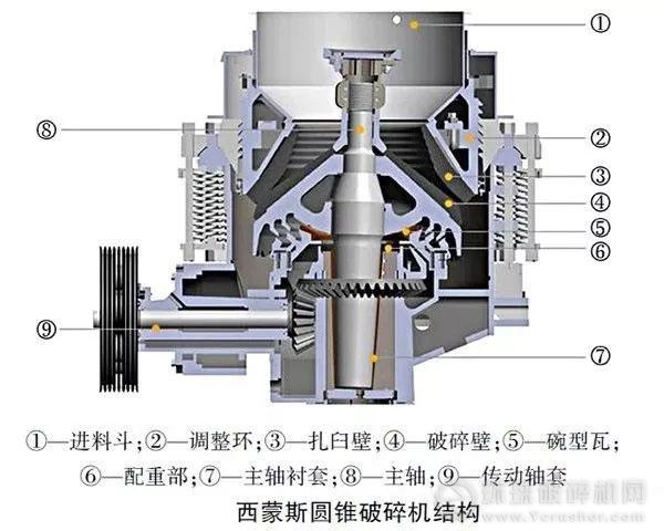 該機的缺點是能耗較高,機器笨重,產量也偏低。隨著圓錐破日益高能化的發(fā)展方向,該機也將逐漸被液壓圓錐破取代。