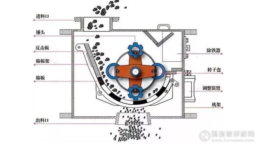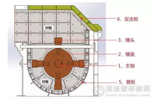 破碎機中,即受到高速旋轉(zhuǎn)的錘頭沖擊。小塊物料受沖擊被破碎,并從錘頭處獲得動能,以高速向反擊板6沖擊而遭第二次破碎。