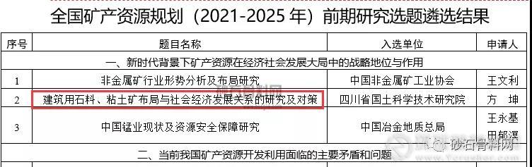 10月8日,自然資源部網(wǎng)站公布全國礦產(chǎn)資源規(guī)劃(2021-2025年)前期研究選題遴選結(jié)果,砂石綠色開發(fā)布局、建筑石料與社會(huì)經(jīng)濟(jì)發(fā)展關(guān)系等成功入選!