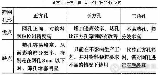 把孔形為正方孔、長方孔和三角孔3種篩網(wǎng)的性能做一比較見表。從表2中可以看出,在這種篩網(wǎng)中,三角孔防堵篩網(wǎng)是首選的篩分效率高,不易堵孔的小網(wǎng)孔篩網(wǎng)。