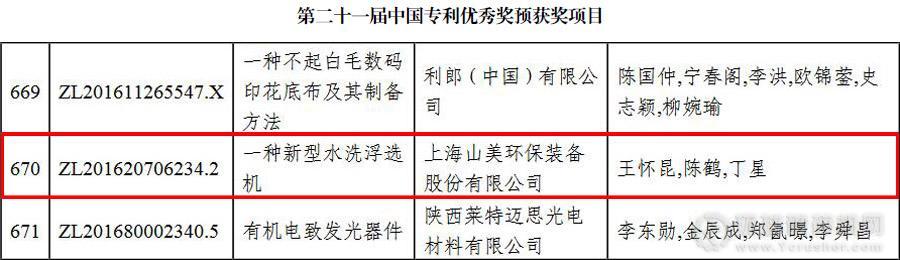山美股份的“一種新型水洗浮選機”專利榮獲國家知識產(chǎn)權(quán)局“第二十一屆中國專利優(yōu)秀獎”,山美是砂石骨料行業(yè)的唯一獲獎單位。該專利由中國砂石協(xié)會向國家知識產(chǎn)權(quán)局推薦,并于近期在國家知識產(chǎn)權(quán)局官方網(wǎng)站完成評審結(jié)果公示。