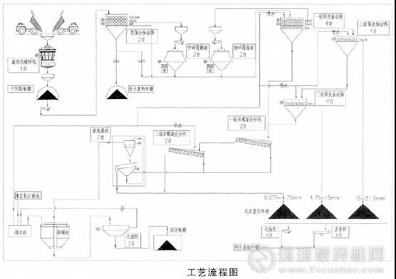 這里濾水振動(dòng)篩選擇了直線振動(dòng)篩,其余均選用圓振動(dòng)篩。0~4.75mm的產(chǎn)品選用了4臺(tái)兩兩串聯(lián)的雙螺旋洗砂機(jī)作為洗砂設(shè)備。