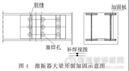 激振器大梁是設(shè)備強度最高的部位,發(fā)生開裂的情況甚少,但現(xiàn)場條件各有不同,若有開裂,其加固方案和底梁類似,但其坡口深度與鋼板厚度一致,焊接質(zhì)量要求高,副板以16mm~20mm鋼板為主,必要時副板上增加強筋。