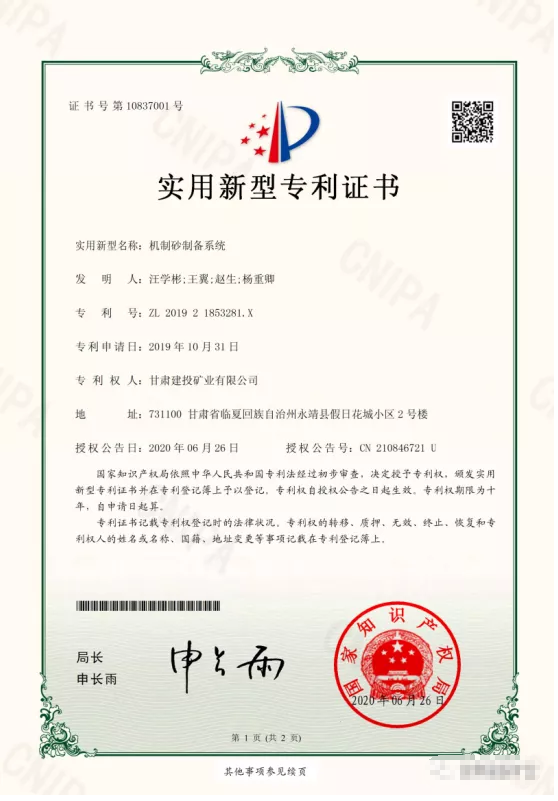 據(jù)悉,甘肅建投礦業(yè)有限公司永靖礦區(qū)申報的《機制砂制備系統(tǒng)》實用新型專利于2020年6月26日正式授權(quán)。