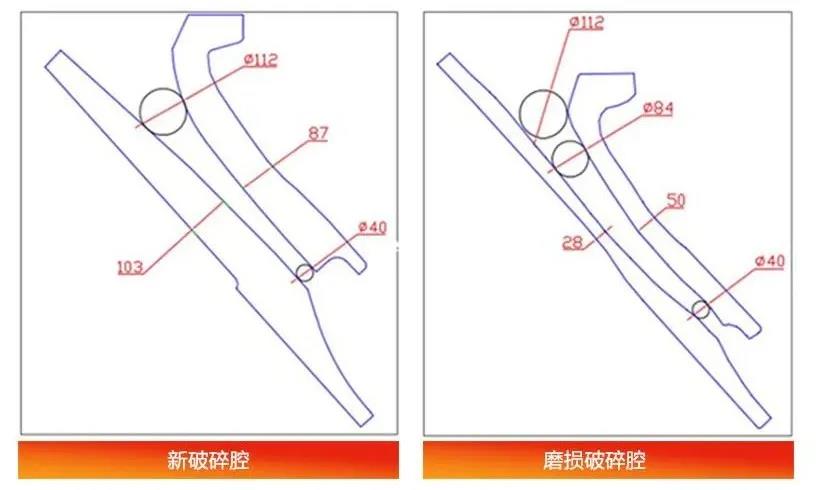 我們通過(guò)下面的圖片來(lái)了解兩者的不同。圖片顯示了兩種情況下,破碎機(jī)襯板的橫截面圖:左圖是沒(méi)有任何磨損的新腔型,而右圖是磨損后的腔型。磨損后的腔型厚度表明,利用率超過(guò)50%,因此我們可以評(píng)估襯板更換時(shí)間節(jié)點(diǎn)。注意,兩個(gè)腔型的緊邊排料口(CSS)都保持在40mm。但可以看到,112mm最大給料粒度位于磨損后腔型的破碎區(qū)之外,而磨損后破碎腔的尺寸為84mm。