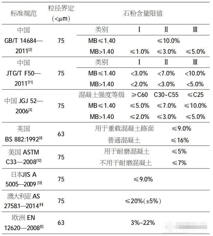 表 2 國內(nèi)外主要標(biāo)準(zhǔn)中機制砂石粉含量最高限值