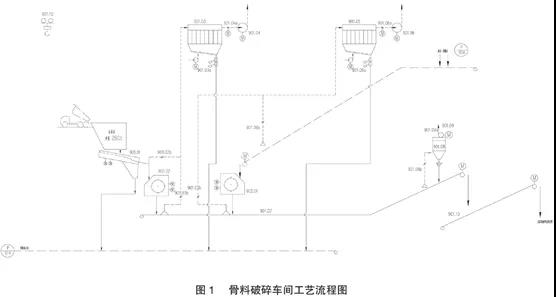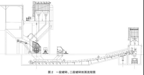 一級單段錘破(或重錘反擊破)進(jìn)料斗上方處設(shè)集中收塵系統(tǒng)和噴霧降塵系統(tǒng),一級及二級破碎機設(shè)集中收塵系統(tǒng)。一段破碎、二段破碎工藝流程見圖2: