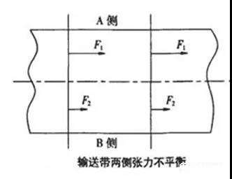 輸送帶在運(yùn)行過程中容易受到損傷,當(dāng)輸送帶中心線兩側(cè)的損傷程度不一樣時,往往兩側(cè)的拉伸率發(fā)生變化,當(dāng)因兩側(cè)的拉伸率相差較大,致使兩側(cè)皮帶的伸長量不一致時,容易造成皮帶跑偏。