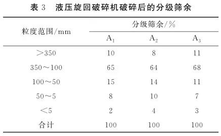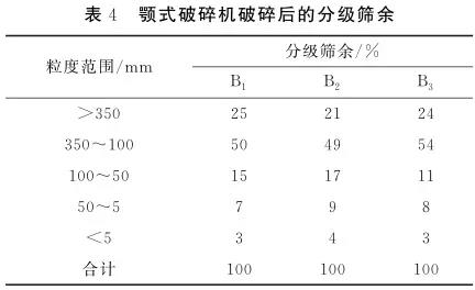 將碎石按照表2中的比例均勻混合后制得6種樣品各1000t,隨機(jī)選取3份通過液壓旋回破,分別編號(hào)為A1、A2、A3。剩余3份進(jìn)入顎破,分別編號(hào)為B1、B2、B3。對破碎后的物料進(jìn)行篩分,結(jié)果見表3、表4: