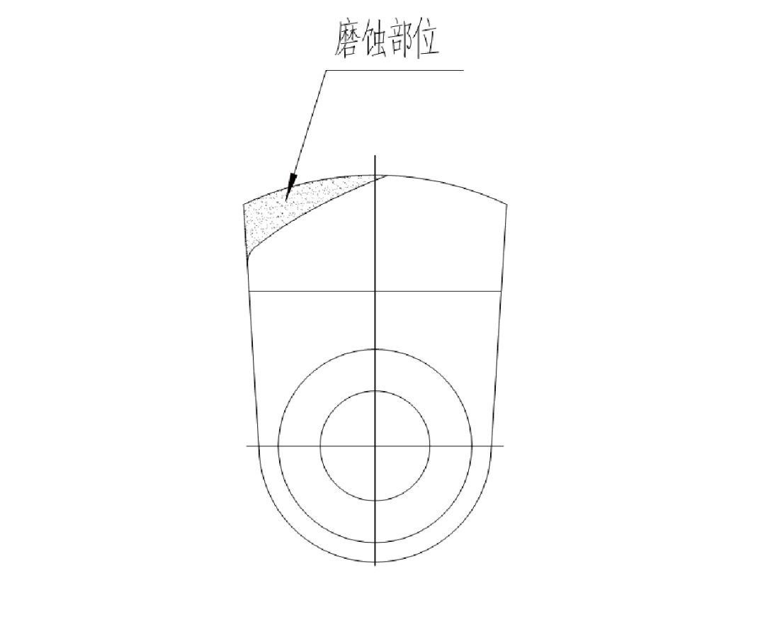 定期檢查錘頭、錘軸、襯板等磨損件的磨損程度,如磨損應(yīng)及時(shí)更換,以免磨壞機(jī)殼或轉(zhuǎn)子盤。錘頭破碎面磨損情況的界定方法:為延長(zhǎng)錘頭使用壽命,當(dāng)錘頭前部棱邊磨損未達(dá)到錘頭底部中心線處時(shí)應(yīng)及時(shí)翻面,以提高錘頭使用率。磨損情況檢查方法,如下圖所示: