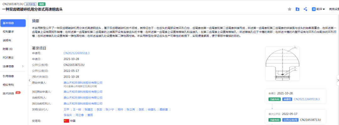 新三板創(chuàng)新層公司天和環(huán)保新增專利信息授權(quán):“一種雙齒輥破碎機用分體式高速鋼齒頭”