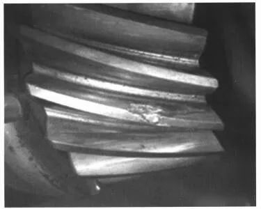 破碎機(jī)過鐵瞬間傳動(dòng)齒輪嚙合受到?jīng)_擊,易造成打齒。大齒輪損傷如圖8所示,小齒輪損傷如圖9所示。