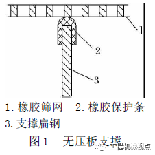 (1)大多的篩分設(shè)備制造廠,在制造篩子時(shí),為了提高有效篩分面積,都把篩網(wǎng)的支撐梁設(shè)計(jì)成一根側(cè)立的鋼板,再在鋼板上壓一塊或襯一塊橡膠保護(hù)條(如圖1所示)。由于支撐梁太小,所以上面沒法再加裝壓板。