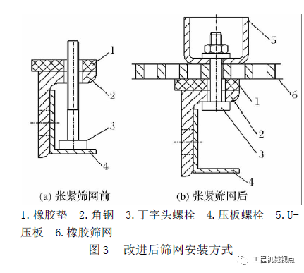 (1)將支撐梁(扁鋼)改為角鋼,再在角鋼上表面襯膠,減少篩網(wǎng)與角鋼的剛性接觸;