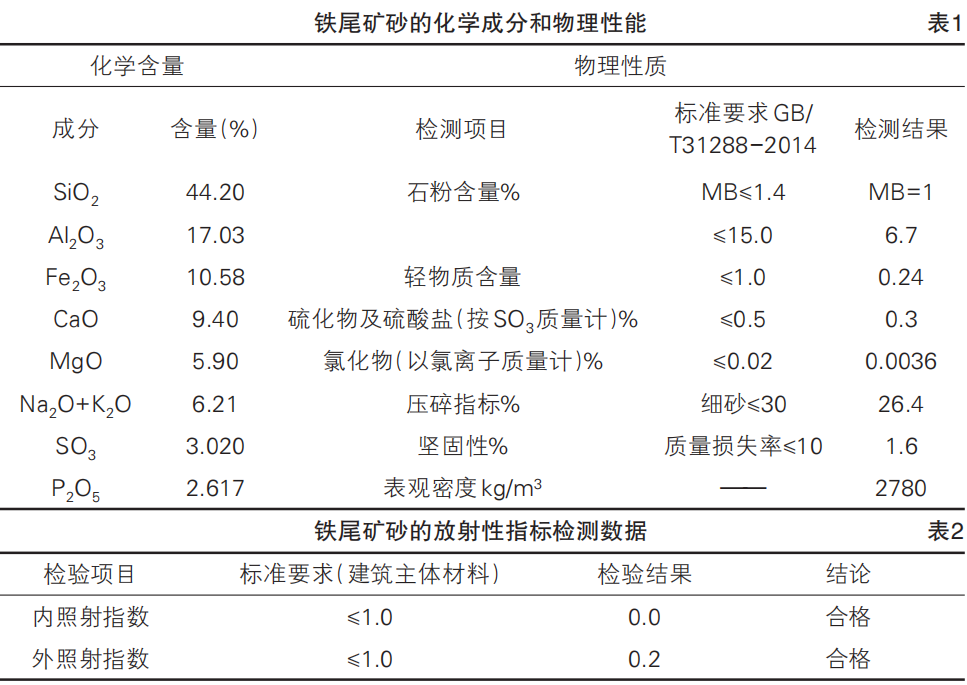 本研究中使用的鐵尾礦砂,來源于安徽省馬鞍山市,其外觀如圖1所示,顏色呈灰黑色,通過篩分析試驗測得鐵尾礦砂的細度模數(shù)為 1.4。按照《鐵尾礦砂》(GB/T31288-2014)標準規(guī)定的試驗方法測試了鐵尾礦砂的有害物質含量、堅固性等指標,結果表明這些指標符合 GB/T31288-2014的要求。對鐵尾礦砂進行理化性質分析,測得其化學成分和相關物理指標如表 1 所示,其放射性指標見表 2。鐵尾礦砂的放射性指標符合《建筑材料放射性核素限量》(GB6566-2010)的要求。