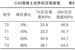 依據(jù)《普通混凝土配合比設計規(guī)程》(JGJ 55-2011),河砂中摻加鐵尾礦砂做細骨料配制C40混凝土配合比見表6,T0~T3采用相同的水灰比去配制 C40