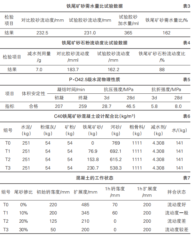 鐵尾礦的主要化學成分有 SiO2、Fe2O3、Al2O3、CaO、MgO,化學成分會因地區(qū)差異略有不同,主要礦物組成為石英、赤鐵礦、白云石、長石等,總體上鐵尾礦的化學成分和礦物成分相似。對于鐵尾礦砂的研究,張玉琢等人將不同比例的鐵尾礦砂與天然砂混合制備鐵尾礦砂混凝土當鐵尾礦砂的取代率為50%時,混凝土拌合物的工作性良好,達到了預拌混凝土大流動性的施工要求;王玉雅等人將鐵尾礦作為細集料取代天然砂,隨鐵尾礦砂取代率的增加,C50混凝土不同齡期的抗壓強度、劈裂抗拉強度均逐漸降低,當鐵尾礦砂取代率為 20%時,C50 混凝土的 28 d、60 d、90d 強度與未摻鐵尾礦砂的基準組相比降幅均較小;仝宵等人[8]對不同摻量鐵尾礦砂和再生骨料再生混凝土性能進行了試驗研究,在鐵尾礦砂取代率為 30% 時,水化程度最大,鐵尾礦砂對于硬化體系堆積填充作用最為明顯,使混凝土內部結構更加密實。本文以鐵尾礦砂為混凝土細骨料,配制C40混凝土,實現(xiàn)鐵尾礦的有效利用。