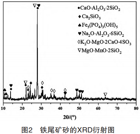 圖 2 是鐵尾礦砂的 XRD 圖譜分析,可以確定該鐵尾礦砂的礦物組成,從XRD 的各個峰來看,本實驗中所使用的鐵尾礦砂成分較復雜,多個物質晶相中都有 SiO2,推測該鐵尾礦砂樣品中 SiO2成分含量較多,并且含有 CaO,Al2O3,F(xiàn)e2O3,Na2O,P2O5,MgO,K2O,SO3,MnO等雜質。該樣品中含有CaO,沒有C 元素,推測沒有石灰?guī)r成分,CaO·Al2O3·2SiO2 推測可能為長石混合物,Ca2SiO3,Na2O·Al2O3·6SiO2 推 測 可 能為粘土和石英砂混合物,MgO·MnO·2SiO2推測可能均為含有雜質的石英砂混合物,K2O·MgO·CaO·4SO3推測可能為含有硫化物成分的雜質,F(xiàn)e5(PO4)3(OH)5推測可能為少量的磁鐵礦及磷化物的混合雜質。
