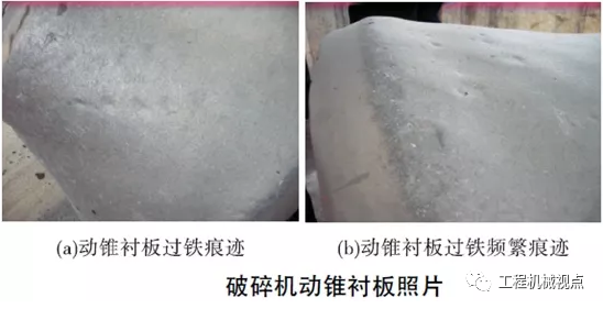 (5)破碎過(guò)程中破碎腔經(jīng)常進(jìn)入鐵塊,鐵塊硬度比較大,破碎負(fù)荷激烈變化增大,超過(guò)襯板的額定破碎負(fù)荷時(shí),襯板易破裂失效。