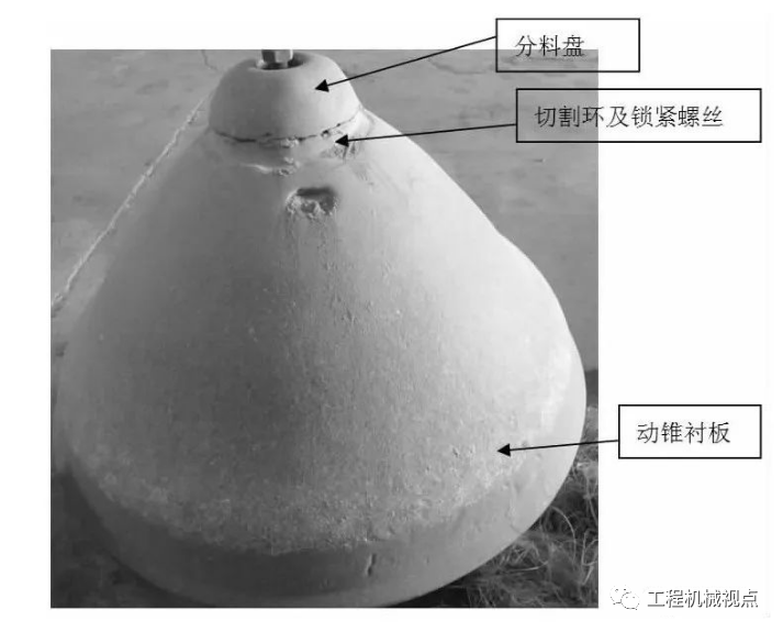 由于現(xiàn)場(chǎng)沒(méi)有備用的主軸和上架體,每次更換襯板時(shí),填料沒(méi)有到達(dá)足夠強(qiáng)度就投入使用,這樣就造成了破碎力直接作用在錐體上,容易造成錐體出現(xiàn)裂紋。