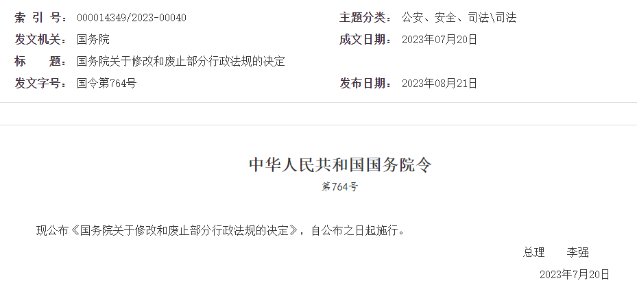 日前,國務院總理李強簽署《國務院關于修改和廢止部分行政法規(guī)的決定》國務院令,并于2023年08月21日發(fā)布,自公布之日起施行。